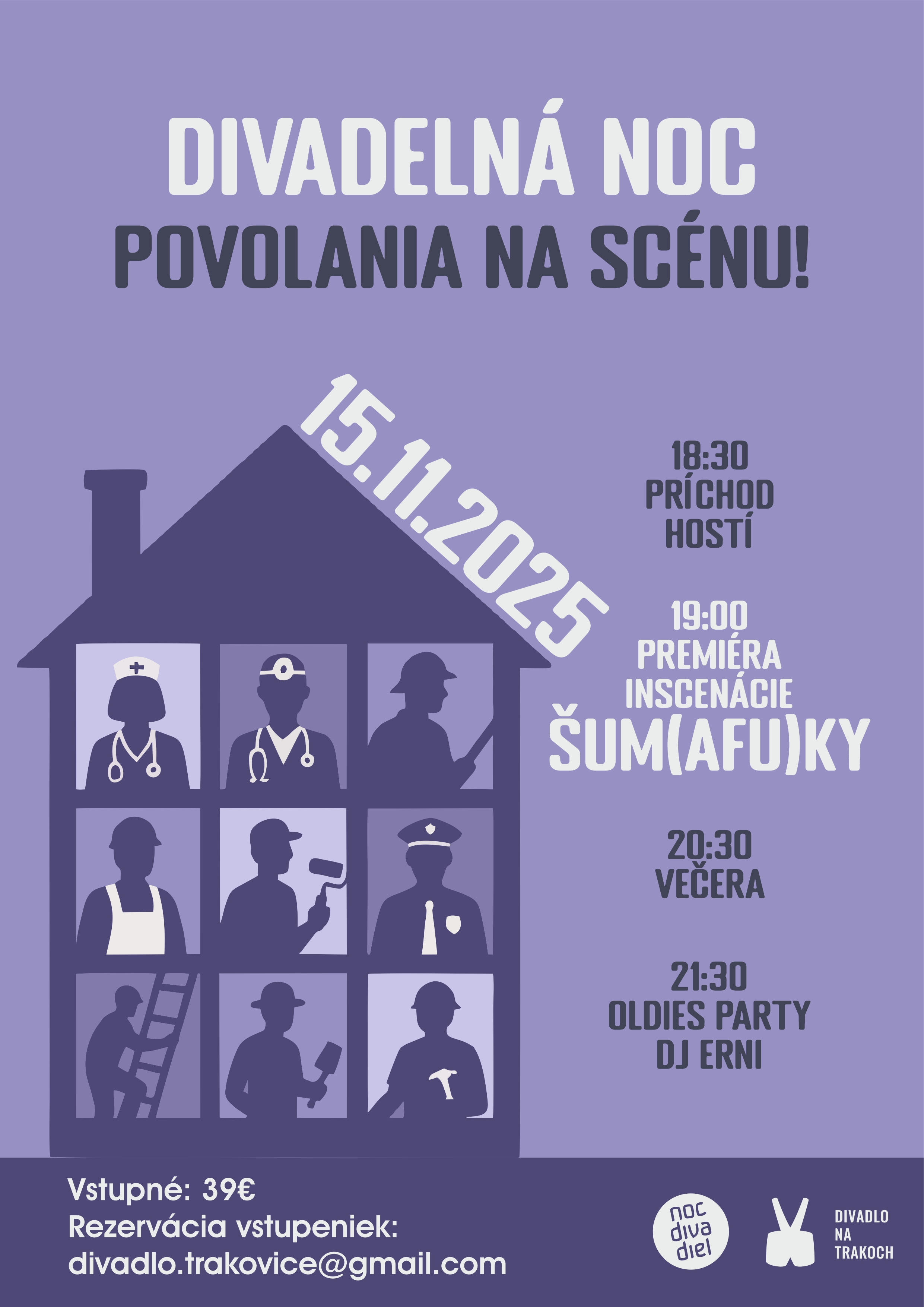 Divadlo na TrakOch srdečne všetkých pozýva na mimoriadny večer v rámci podujatia Noc divadiel. Program sa začne o 18.00 príchodom hostí a slávnostným otvorením s aperitívom. Hlavným bodom večera je premiéra novej inscenácie ŠUM(AFUK)Y.